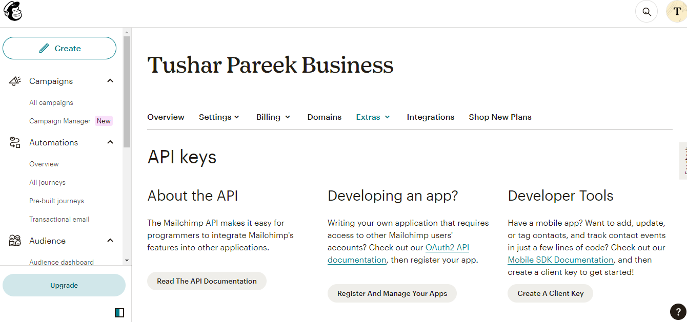 Once we are at the home page of mailchimp, we need to find two values from the dashboard of mailchimp to integrate mailchimp with graphy!