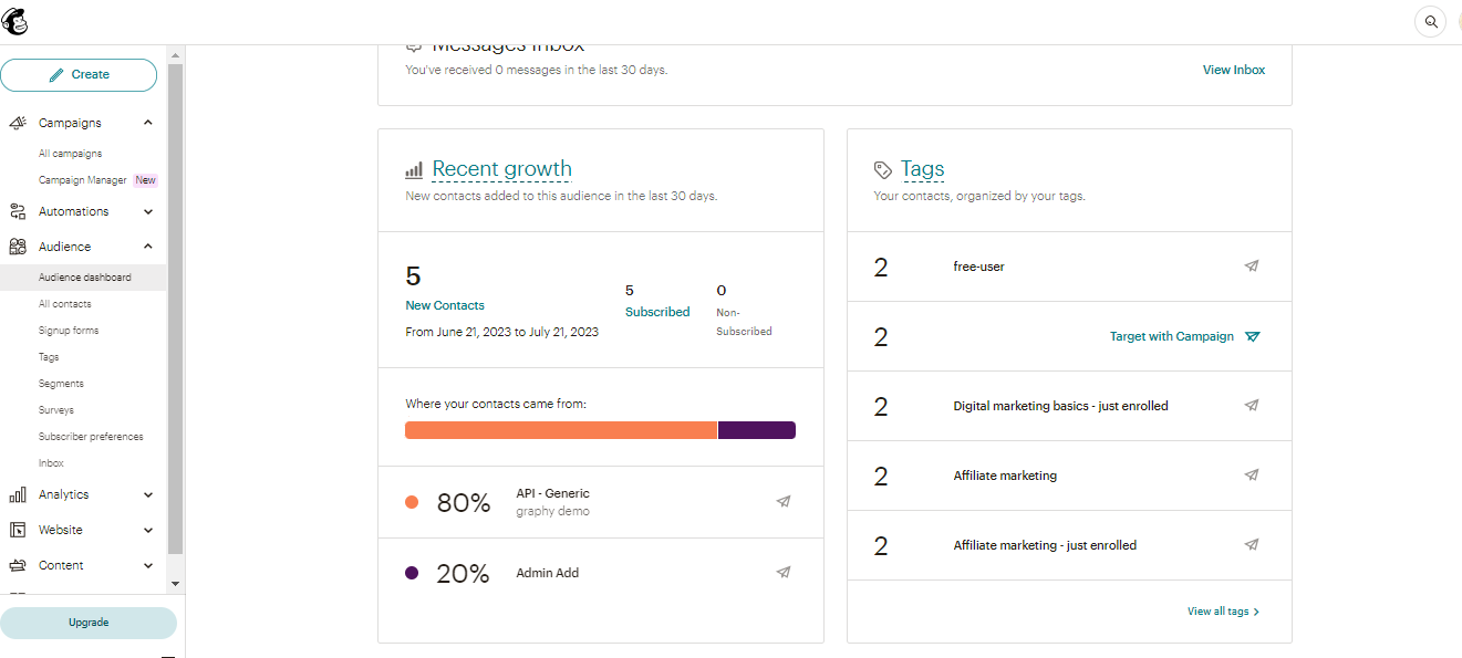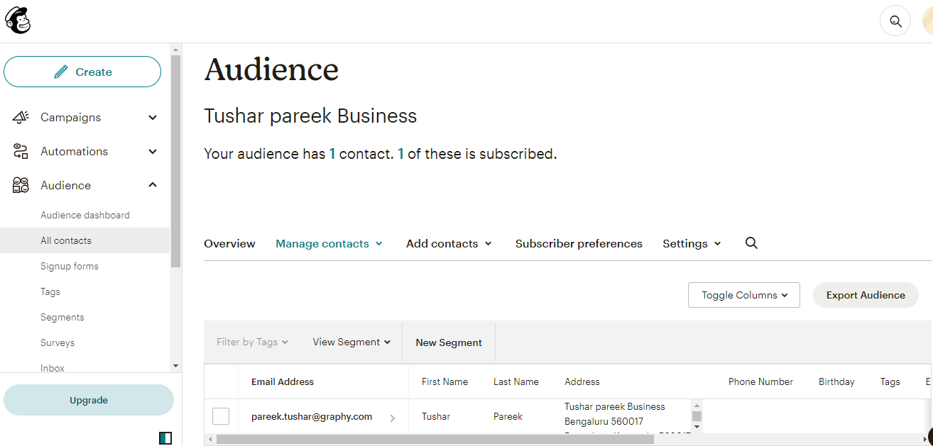 Once we have successfully integrated Mailchimp with graphy website, We would be able to track the New customers list in the Audience dashboard section of Mailchimp and create different sort of automations as well as email campaigns using mailchimp.