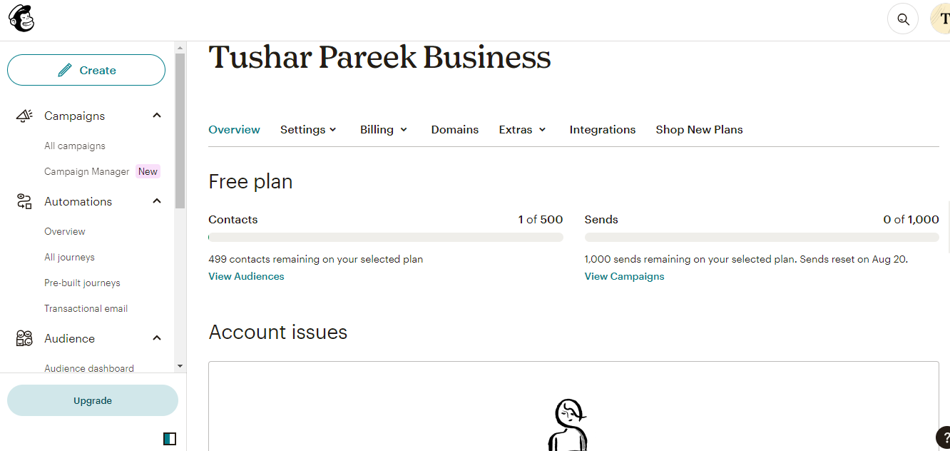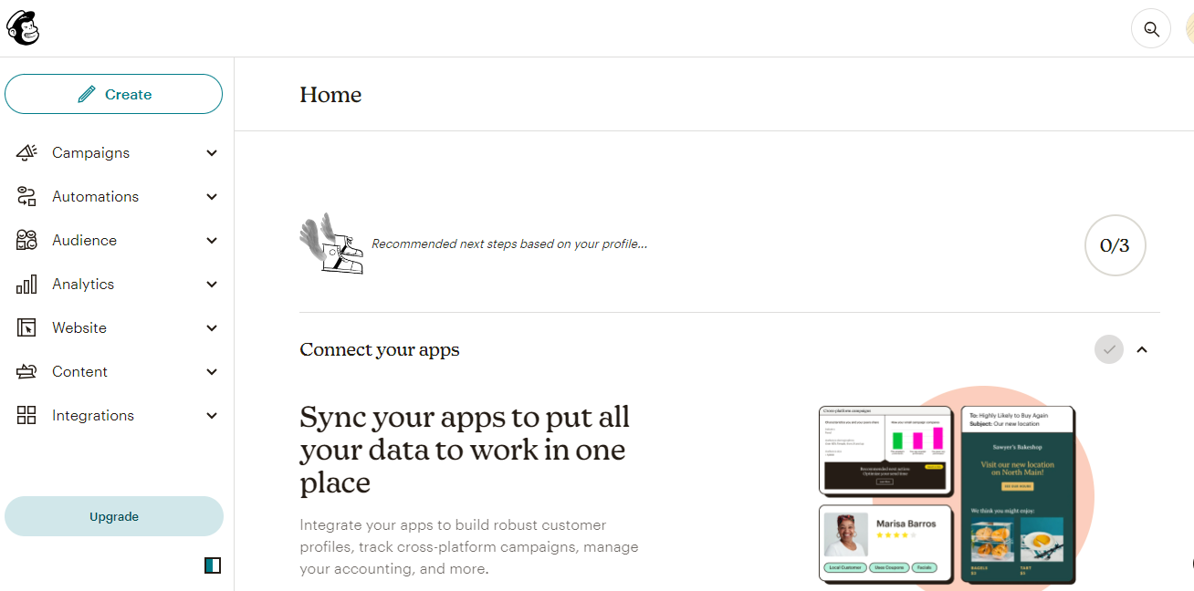 After verification of the email address, we’re redirected to the home page of Mailchimp!