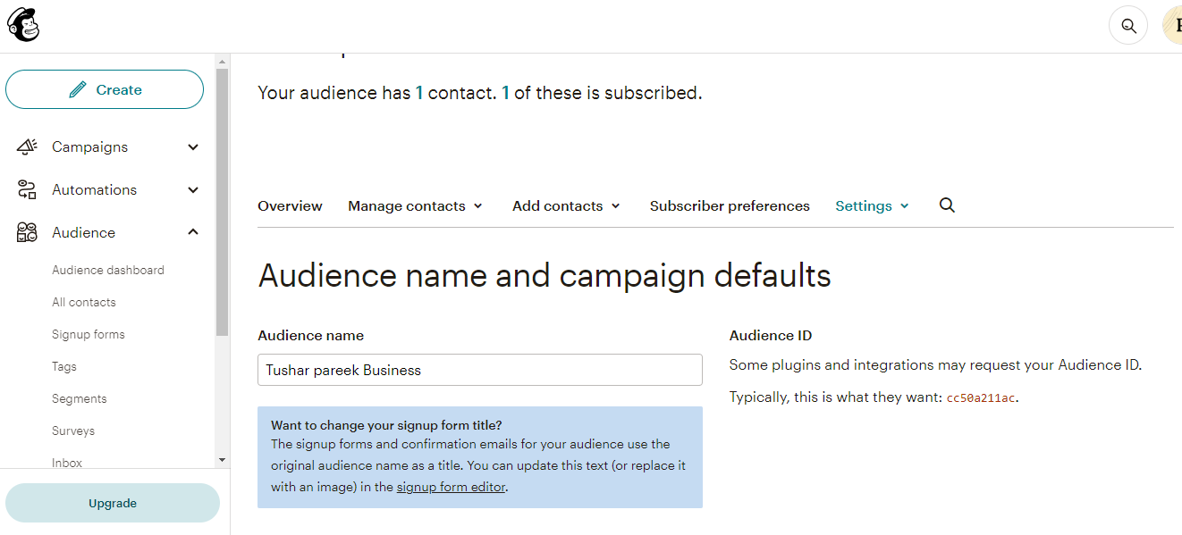 Now, we fill find the value of Audience Id from the Mailchimp dashboard